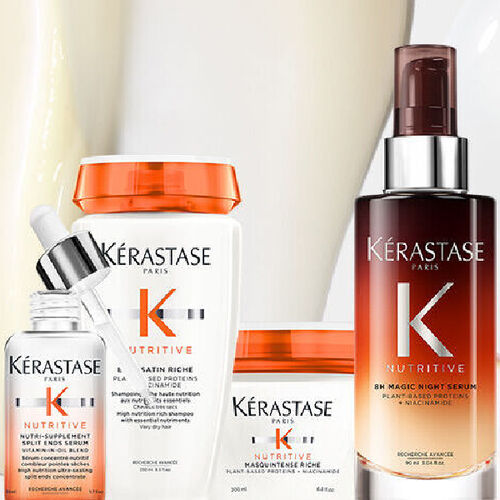 La gamme de soins capillaires Nutritive est spécialement formulée pour traiter les cheveux secs à sévèrement secs. La gamme complète de produits de soins capillaires ultra-hydratants, hydratants et nourrissants comprend un shampoing, un après-shampoing, un masque capillaire, un traitement sans rinçage et le sérum capillaire 8 hour magic night, best-seller et primé. Le résultat est des cheveux hydratés, plus doux et plus sains. Kerastase Nutritive vise à fournir le meilleur des soins capillaires professionnels de luxe pour tous les cheveux secs à sévèrement secs.